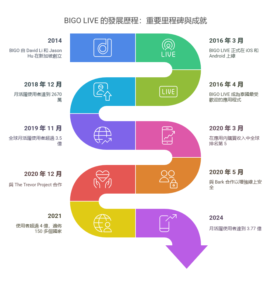 - 創立與上線:BIGO於 2014 年在新加坡由 David Li 和 Jason Hu 創立,並於 2016 年 3 月 正式推出BIGO LIVE,適用於 iOS 和 Android 作業系統。